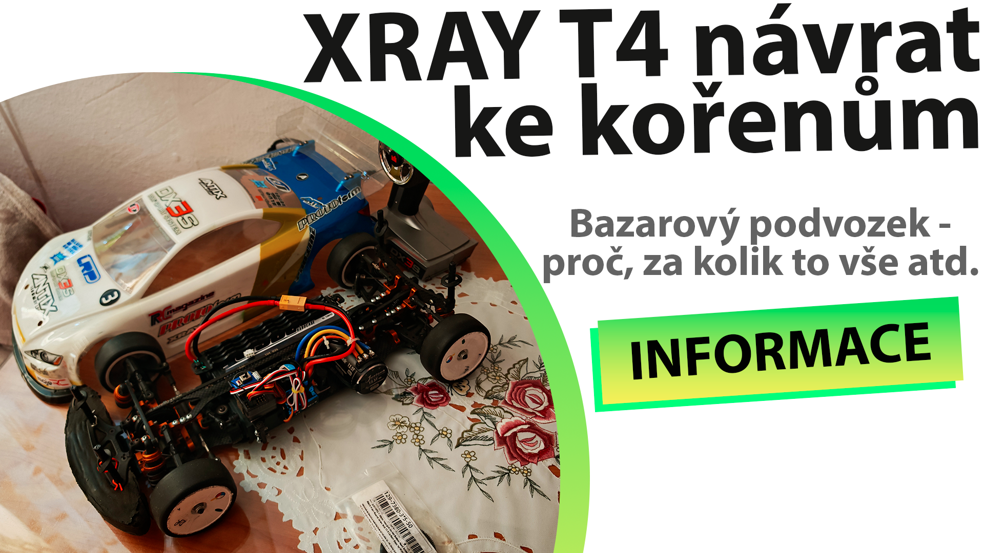 Chtěl jsem zůstat u XRAY X1 2018, se kterým občas jedu závody MR Cup. Ale 3 kamarádi (modeláři) propadli onroad ježdění na dráze v Blansku se závodními podvozky (ne RTR podvozkem plastovým apod.). Takže si pořídili podvozky XRAY, YOKOMO a tlačili na mě, abych si také pořídil 4WD onroad 1/10E. Abych s nimi jezdil a trénoval je. Stačila by na to Formule, ale prostě když to cenově vychází zajímavě… Takže po hodně dlouhé době mám závodní podvozek XRAY T4 s komplet vybavením plus vysílač (bazar). Více v tomto videu.